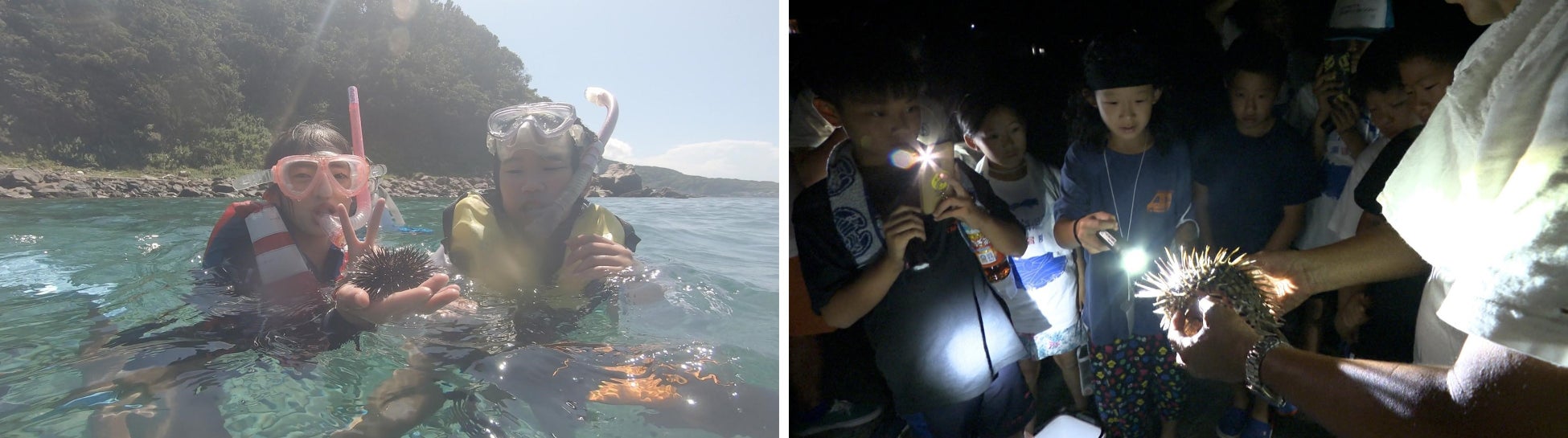 柏島の海の現状について話を聞いた後、子どもたちはシュノーケリングを体験。サンゴ礁や海の生き物を観察しました。昼だけでなく、夜の海にも繰り出し、夜に活動が活発になる生き物についても学びを深めました。初めて、サンゴや海の生き物に触れたという子どもたちもいて、大月町の海の豊かな環境を肌で感じたようでした。